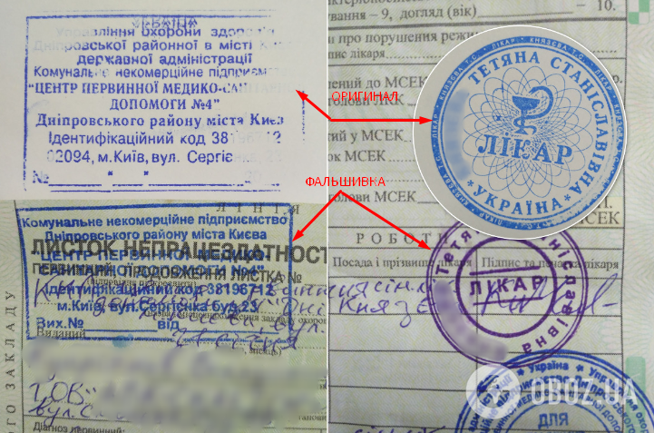 На бланку лікарняного, який нам надіслали, стояли "мокрі печатки" КНП "Центр первинної медико-санітарної допомоги №4" Дніпровського району Києва, що реально існує. Також була печатка лікарки, яка, як з'ясувалося, справді там працює.Журналісти OBOZREVATEL з'їздили в ЦПМСД №4 та поспілкувалися з її директоркою Надією Поливановою, а також із сімейною лікаркою, чиє ім'я було зазначено в фальшивій довідці.