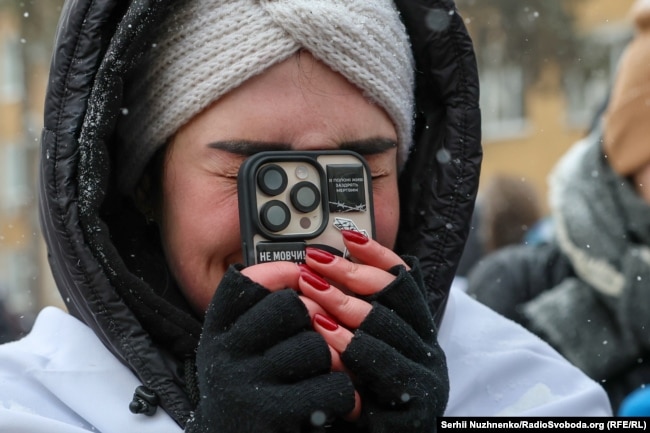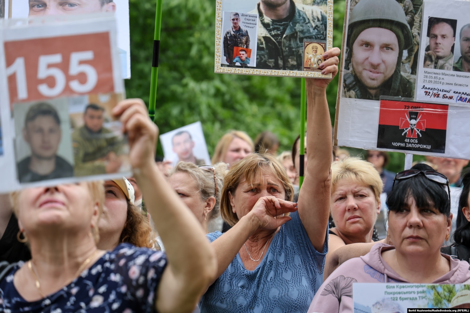 Дружина зниклого безвісти Івана Куковицького, який у Селидово на Донеччині ще восени 2024 року, стоїть із портретом свого чоловіка серед тих, хто чекає на бодай якусь звістку про їхніх рідних.
