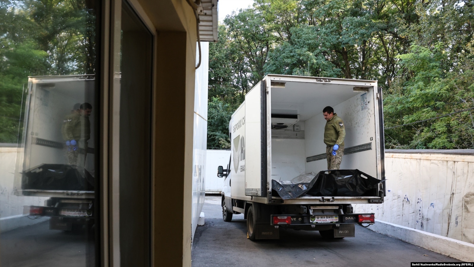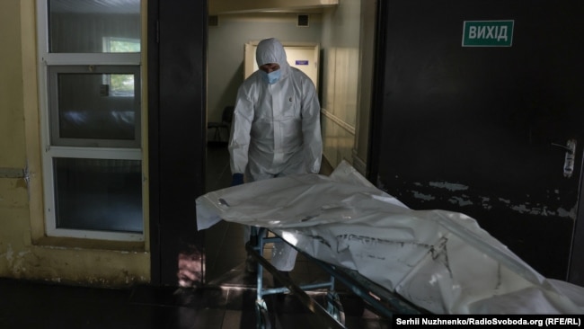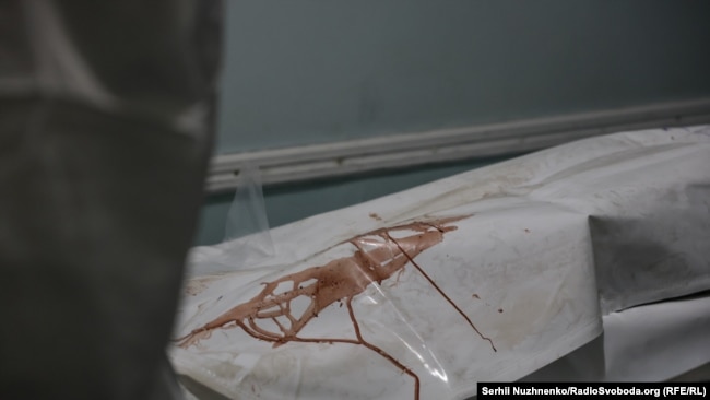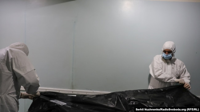 Завідувач відділення Ігор Титарчук веде нас на задній двір, у місце, куди привозять тіла. Він показує нам білі мішки, які складені в ряд на каталках.