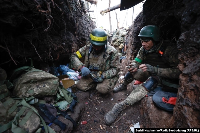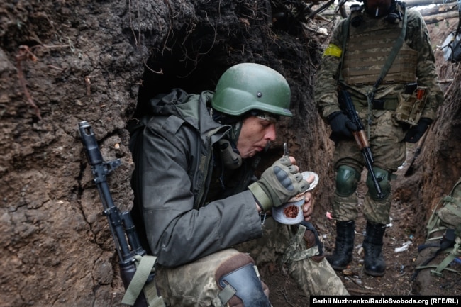 Хтось смачно затягується цигаркою, опершись на бруствер окопу, хтось відкриває консервоване тушковане м’ясо і снідає, а хтось після виснажливої дороги жадібно п'є воду з пляшки.
