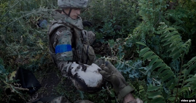 Біля імпровізованого столу-каталки в польовому наметі Галіє Мустафіна разом із помічницею оглядають тіло. Фотографують написи з прізвищем на вивороті форми. Ретельно оглядають кожну кінцівку тіла, знімають з нього залишки одягу.