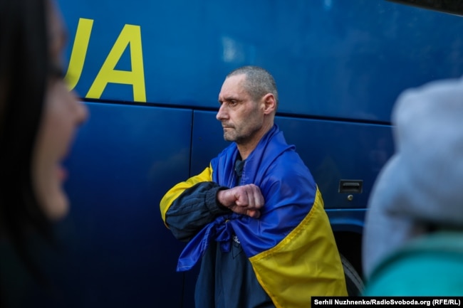 Заїжджають перші автобуси, у вікнах хлопці, огорнуті парпорами України. Виснажені утриманням у нелюдських умовах у тюрмах Росії військові вдивляються у натовп, який кричить «Вітаємо! Вітаємо! Вітаємо!».